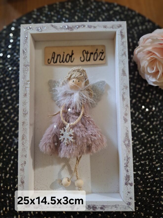 Anioł stróż w białej ramce. Podstawą wykonana z drewna. Dodatkowe zdobienia .wymiary podane na zdjęciu. Gotowy do zawieszenia. PolecamSprawdź zainteresowanie tym ogłoszeniem