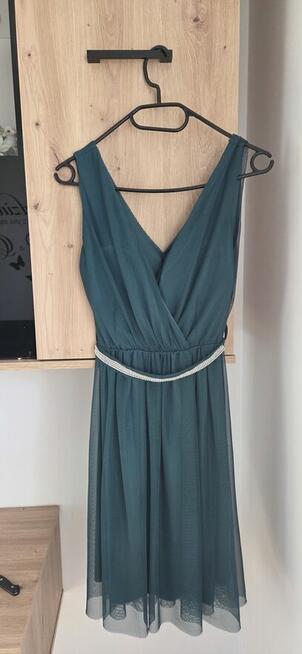 Piękna turkusowo niebieska sukienka z satyny i dół z tiulu stan bardzo dobry firma ASAR z tyłu zamek ,cienkie ...
